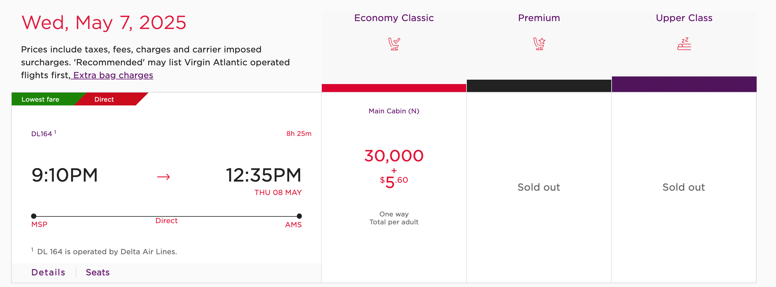 Considering Delta charges 58,000 SkyMiles for the same Main Cabin flight, booking this flight for just 10,000 Virgin points is terrific.
