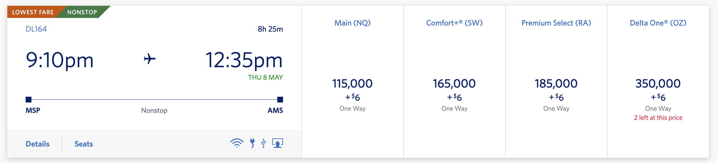 This same Delta flight through SkyMiles would set you back a massive 115,000 miles, so if you have credit card points, it's a much better deal to book through Flying Club than SkyMiles.
