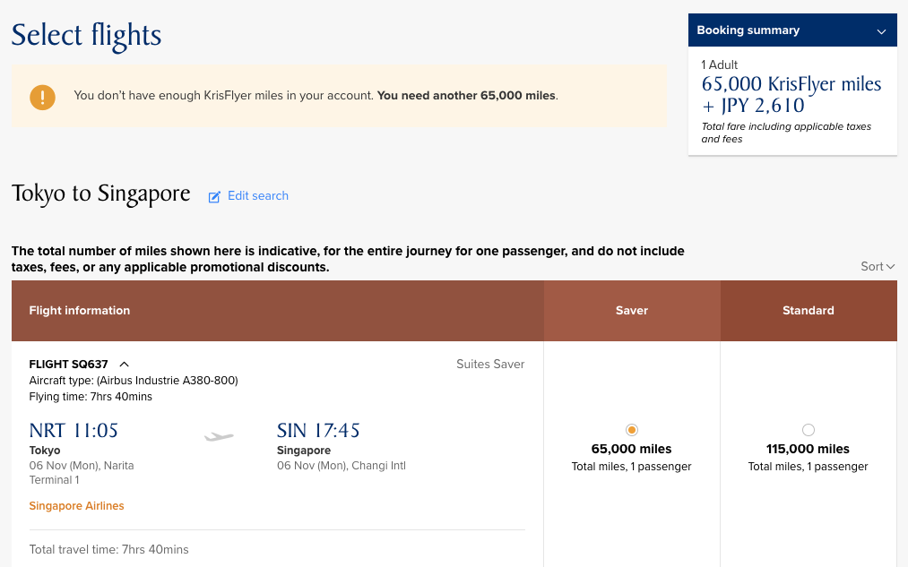 Availability isn't great, but after a few minutes of searching, I did find the following Suites Class award ticket from Tokyo-Narita (NRT) to Singapore (SIN) on November 6: