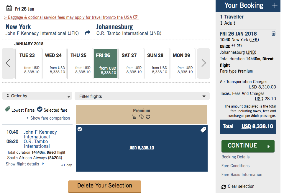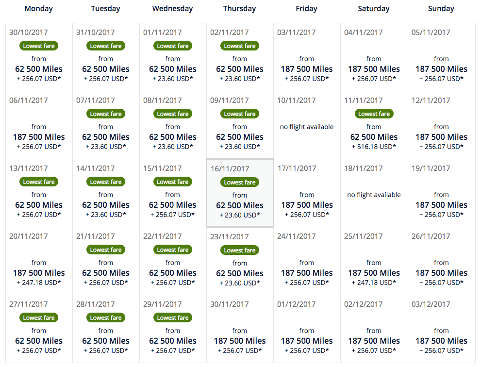 If you wanted to book the flight on November 16, a revenue ticket would cost you $7,660.60, while the award ticket would be a mere 62,500 miles plus $23.60.