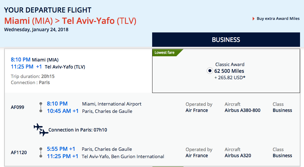 Another angle to play with Flying Blue is how far this 62,500-mile rate extends. Even though Israel isn't a part of Europe, you'll redeem the same number of miles for a one-way business-class award ticket from the US. Here's an example of a one-stop itinerary from Miami (MIA) to Tel Aviv (TLV) with a connection in Paris (CDG):