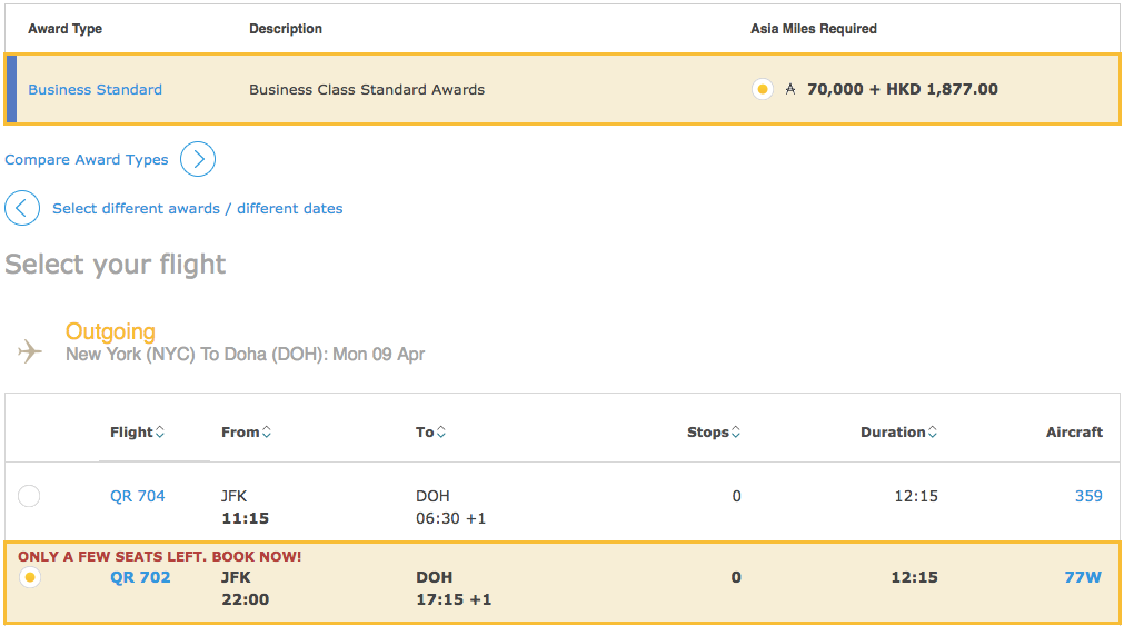 Let's say you wanted to fly from New York-JFK to Doha on Monday April 9. Both of Qatar's nonstop flights have award availability that day, though you may want to choose the 777-300ER in an effort to maximize your chances of enjoying the Qsuites: