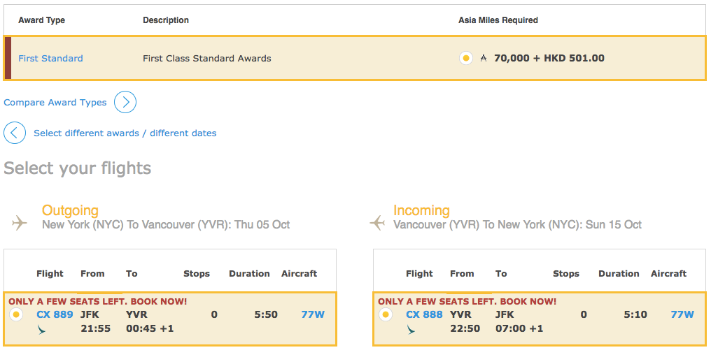 If you've been reading this site for a while, you're probably aware that Cathay Pacific first class is among one of the most comfortable and luxurious ways to fly. While long-haul overseas flights typically require a ton of miles, you may not be aware that one of the carrier's flights from New York-JFK has a stop in Vancouver en route to Hong Kong, and you can book a first-class seat on just the first leg by transferring ThankYou points to the Asia Miles program. 70,000 points will get you a round-trip award ticket, opening up 5-6 hours of bliss for a single sign-up bonus. The best part? Availability is generally quite good.