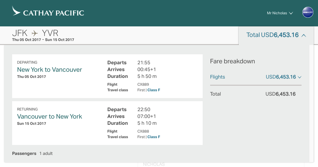 1. Round-Trip First-Class Flights From New York to Vancouver on Cathay Pacific