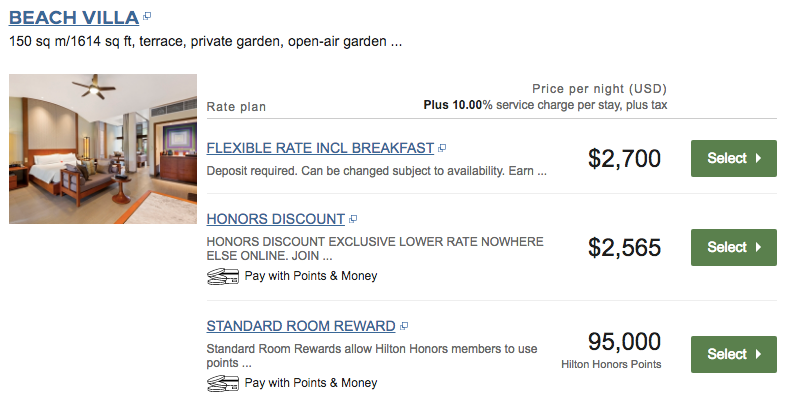 Take the Conrad Maldives Rangali Island, for example. If you were hoping to book a stay at the beginning of January, you might balk at the prices on some nights ($2,000+). However, on the night of January 8, for example, you can redeem 95,000 Hilton points for a "standard" beach villa that is going for over $3,000 per night (when you include taxes and fees):