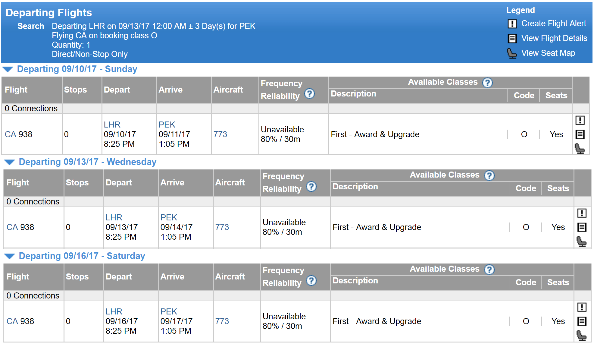 The chart shows round-trip redemption rates. However, unlike Flying Club's ANA redemption chart, you're able to book one-way Air China award flights. That means you can book Air China economy on this long-haul route for 28,000 miles... or first class for 37,500 miles. Not a tough choice there. The astronomical cash fares for this product ensure that there's plenty of award availability.