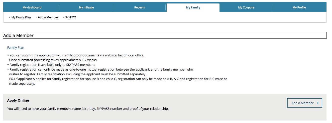 The Family Plan program permits up to five family members to join. Eligible family members include a spouse, children, parents, siblings, parents-in-law, sons-in-law, daughters-in-law, grandparents and grandchildren. You can log in to your SKYPASS account and add a family member online from your dashboard. You can then upload all required documentation.