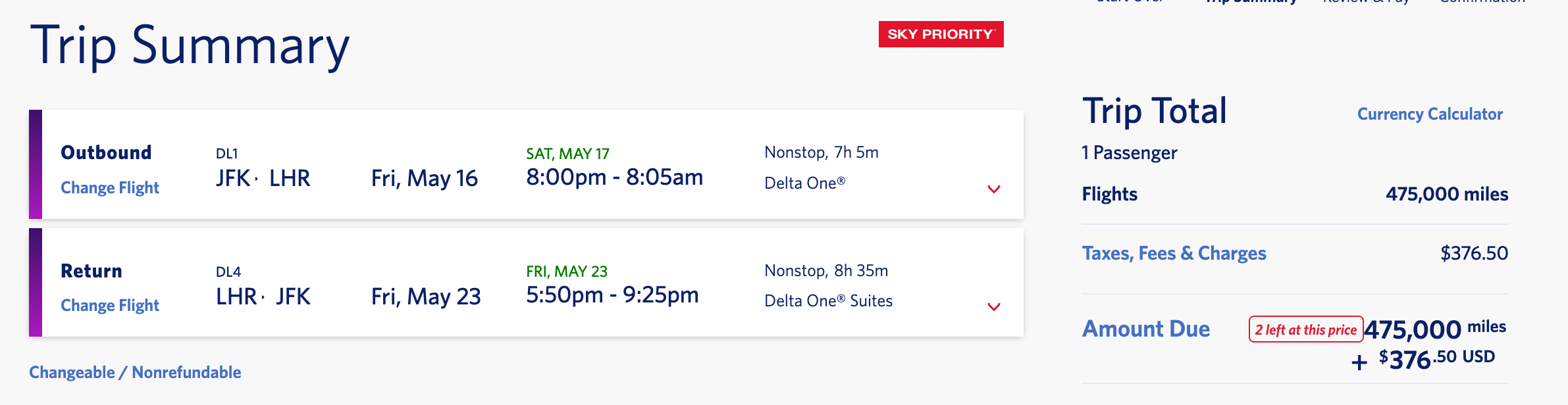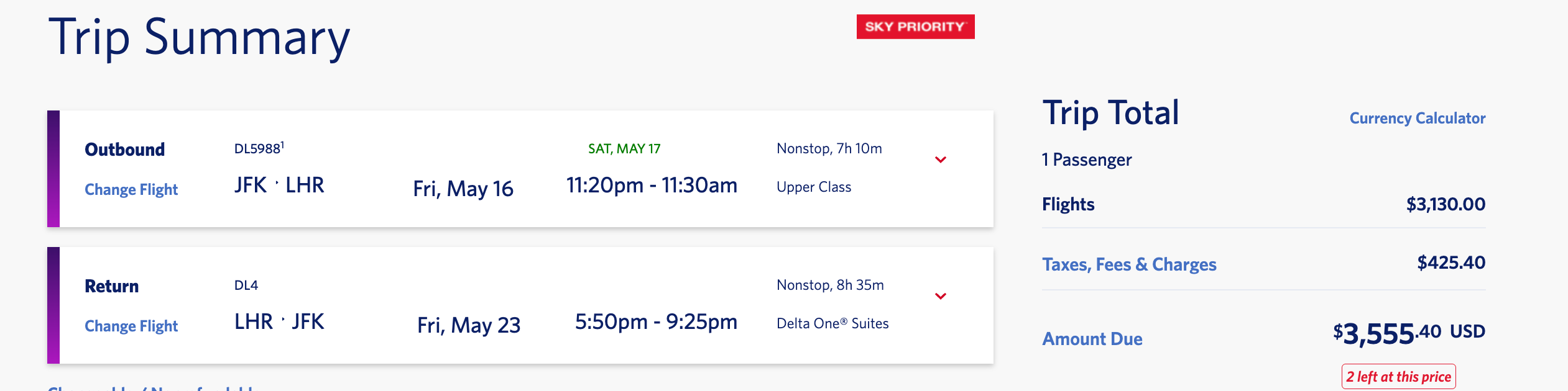 This redemption is still costly, so checking the cash fares on the same dates is worth checking. With Delta offering nonstop business-class flights for $3,555.40 round-trip, paying cash could make more sense since you will also earn SkyMiles for this cash fare.