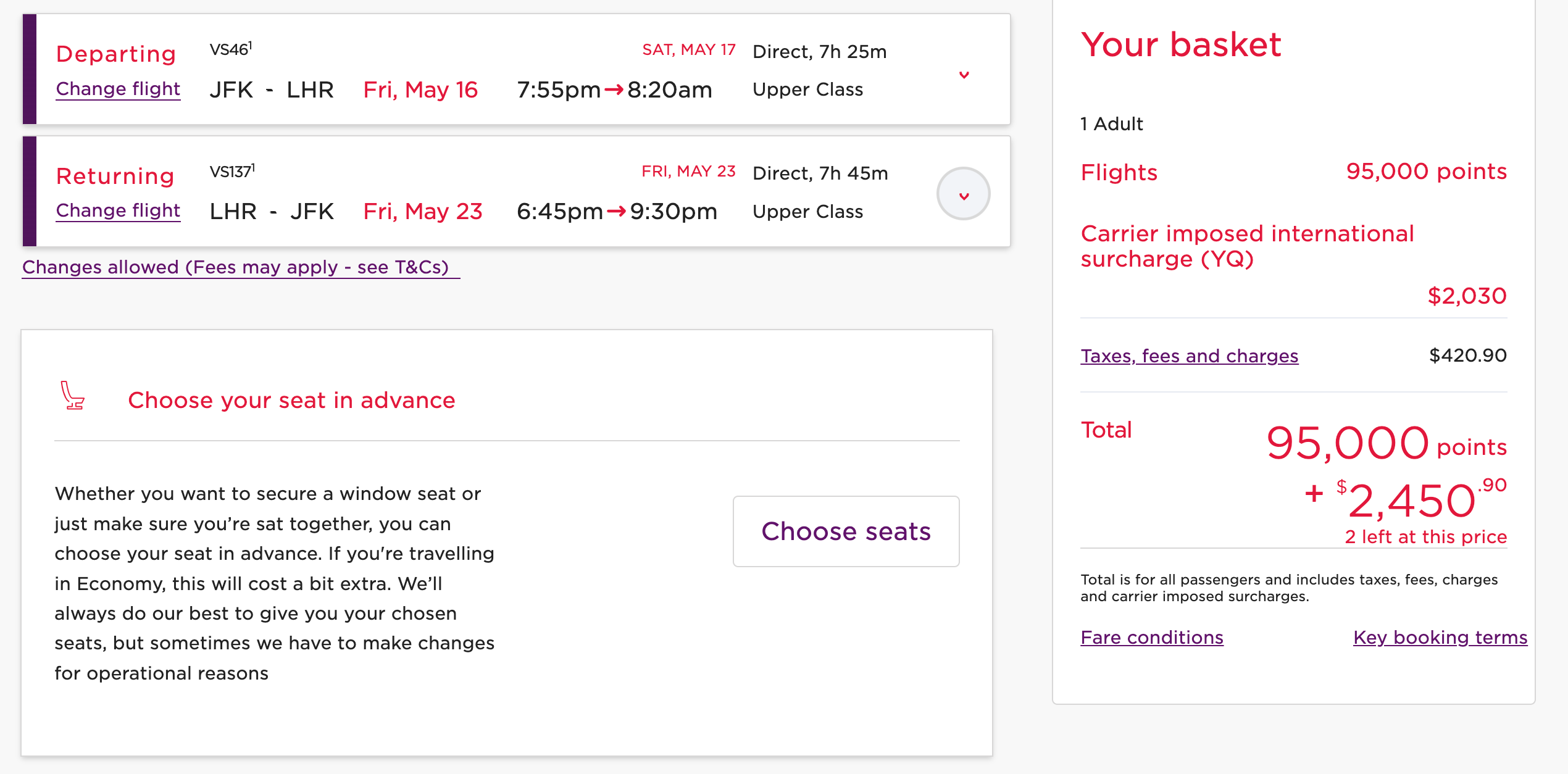 Virgin Atlantic adds an eye-watering $2,000 as a carrier-imposed surcharge. However, you'll only need to part with 95,000 Virgin points, compared with the more than 475,000 SkyMiles option above on the same round-trip New York-to-London option.