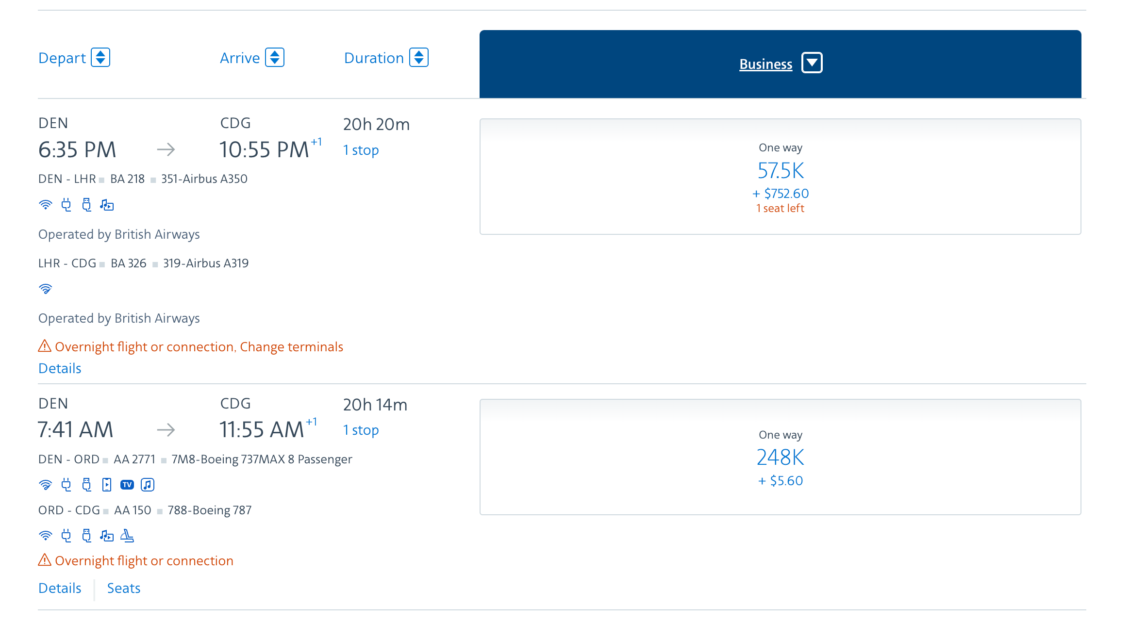 Let's look at a one-way business-class redemption from Denver International Airport (DEN) to Paris-Charles de Gaulle Airport (CDG) in April 2025. As there are no nonstop options bookable through AAdvantage, you could choose to fly British Airways via London or American Airlines via Dallas. The British Airways option is priced using an award chart, so fewer miles are required, but the surcharges are greater; the American-operated option is priced dynamically but without surcharges, so more miles but less cash are required.