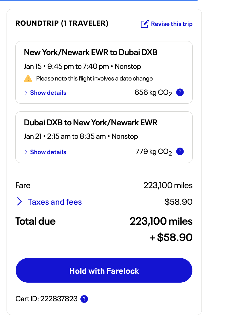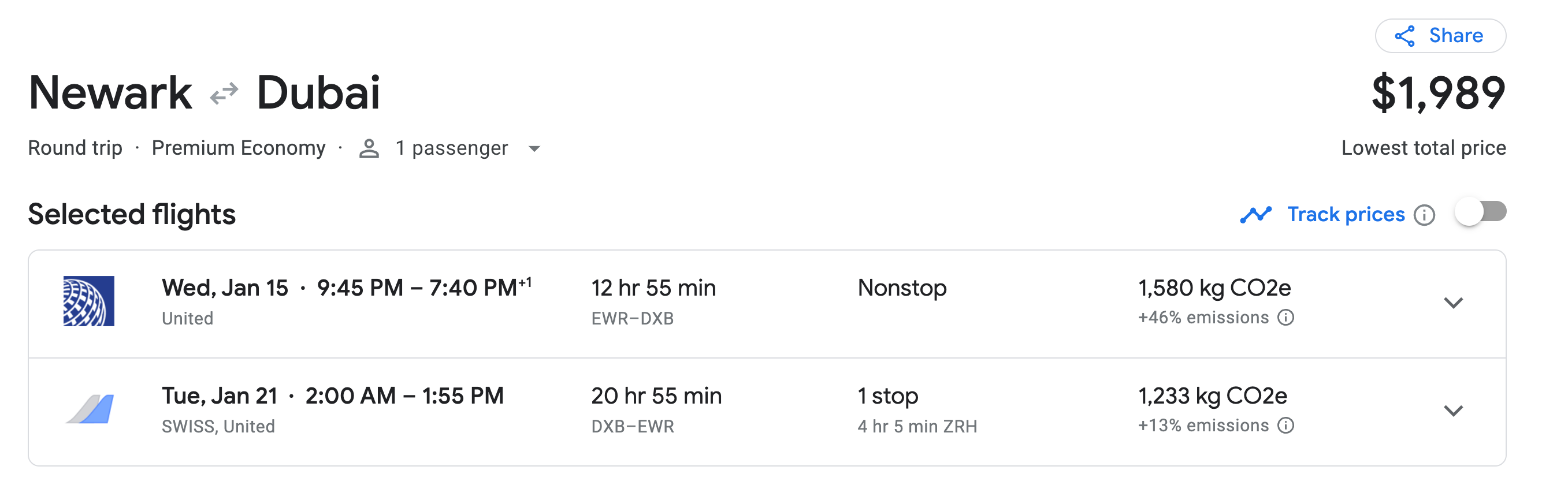 With United Airlines' nonstop service from Newark Liberty International Airport (EWR) to Dubai International Airport (DXB) now operational, let's compare the cost of flying the route in premium economy in January 2025, an excellent time to visit sunny Dubai. You could book through United MileagePlus for 233,100 miles plus a low $58.90 in fees and taxes, as United does not charge surcharges.