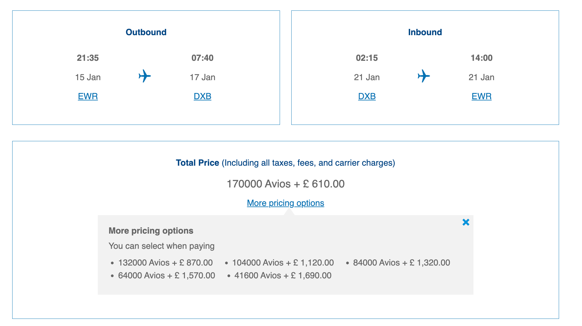 Alternatively, you could book through a program with a fixed award chart, like British Airways Executive Club. This program charges fewer Avios (170,000) but adds 610 British pounds ($854) in taxes, fees and surcharges for a similar route that is not direct.