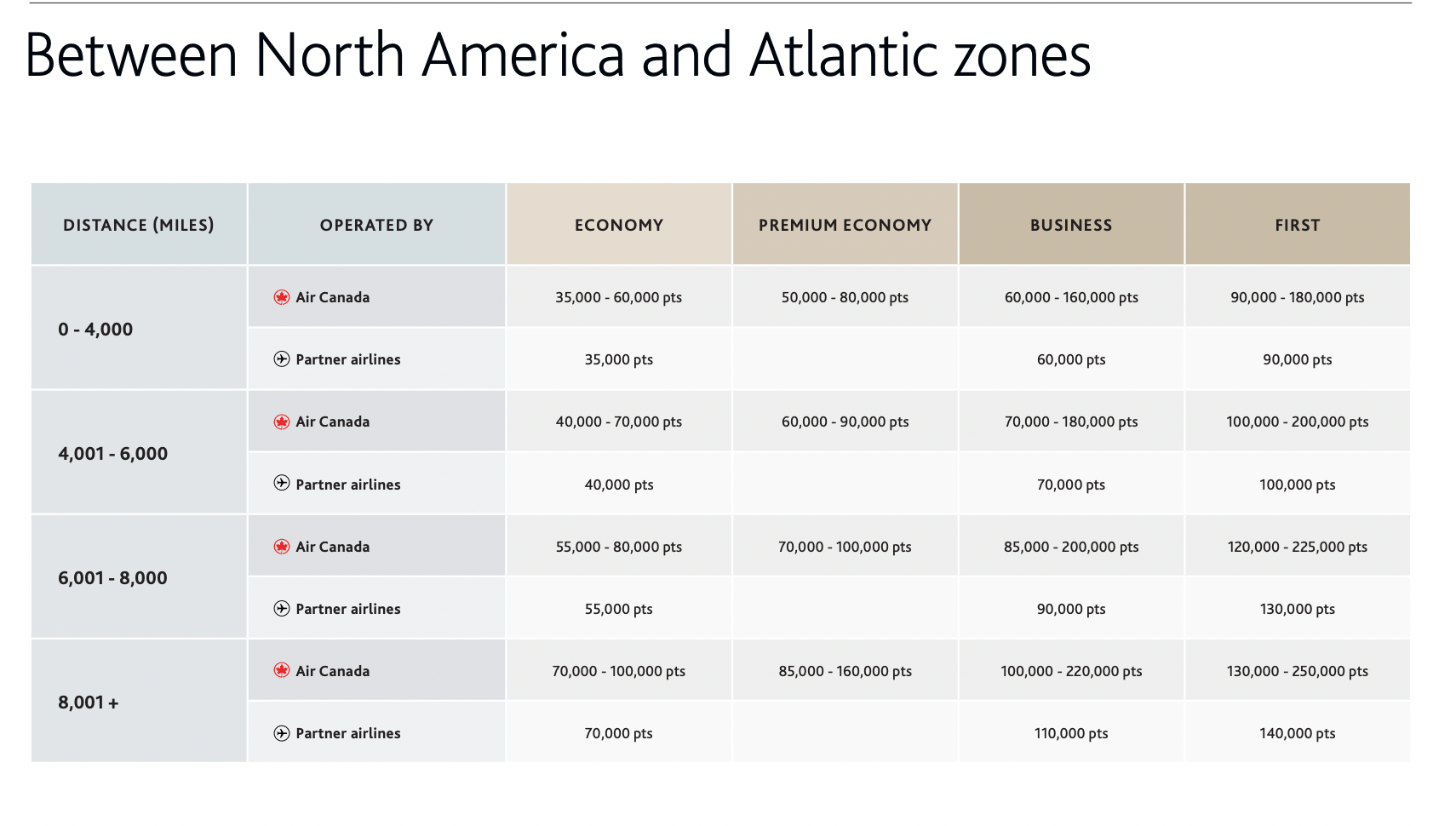 Then, look at the program's award chart to find the exact number of points required to book your flights. In this case, we are looking for the "Between North America and Atlantic zones" award chart.