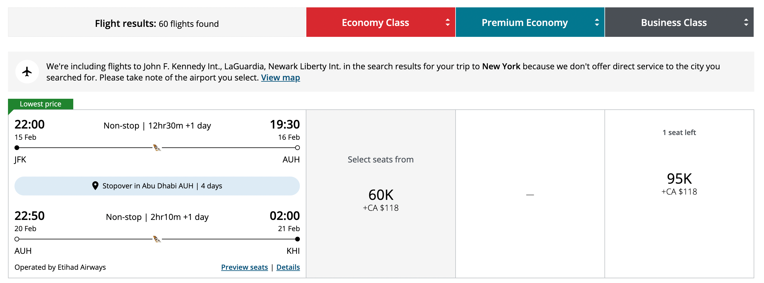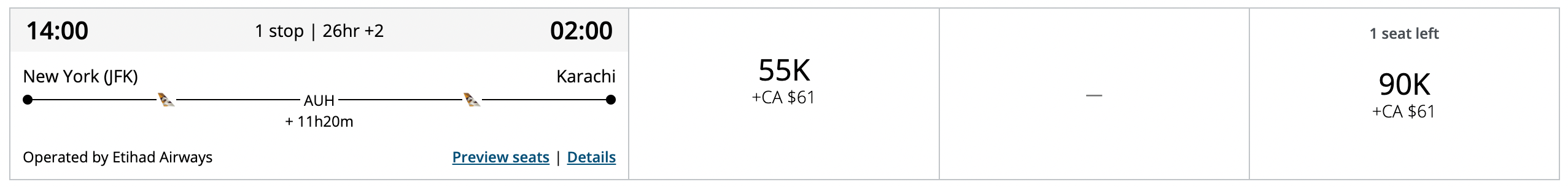 Here is what it would look like if you were booking an award ticket from New York to Karachi without a stopover. It would cost 90,000 points to get to Karachi in Etihad Airways business class. For just 5,000 more points, you can add a few days in Abu Dhabi to your trip.