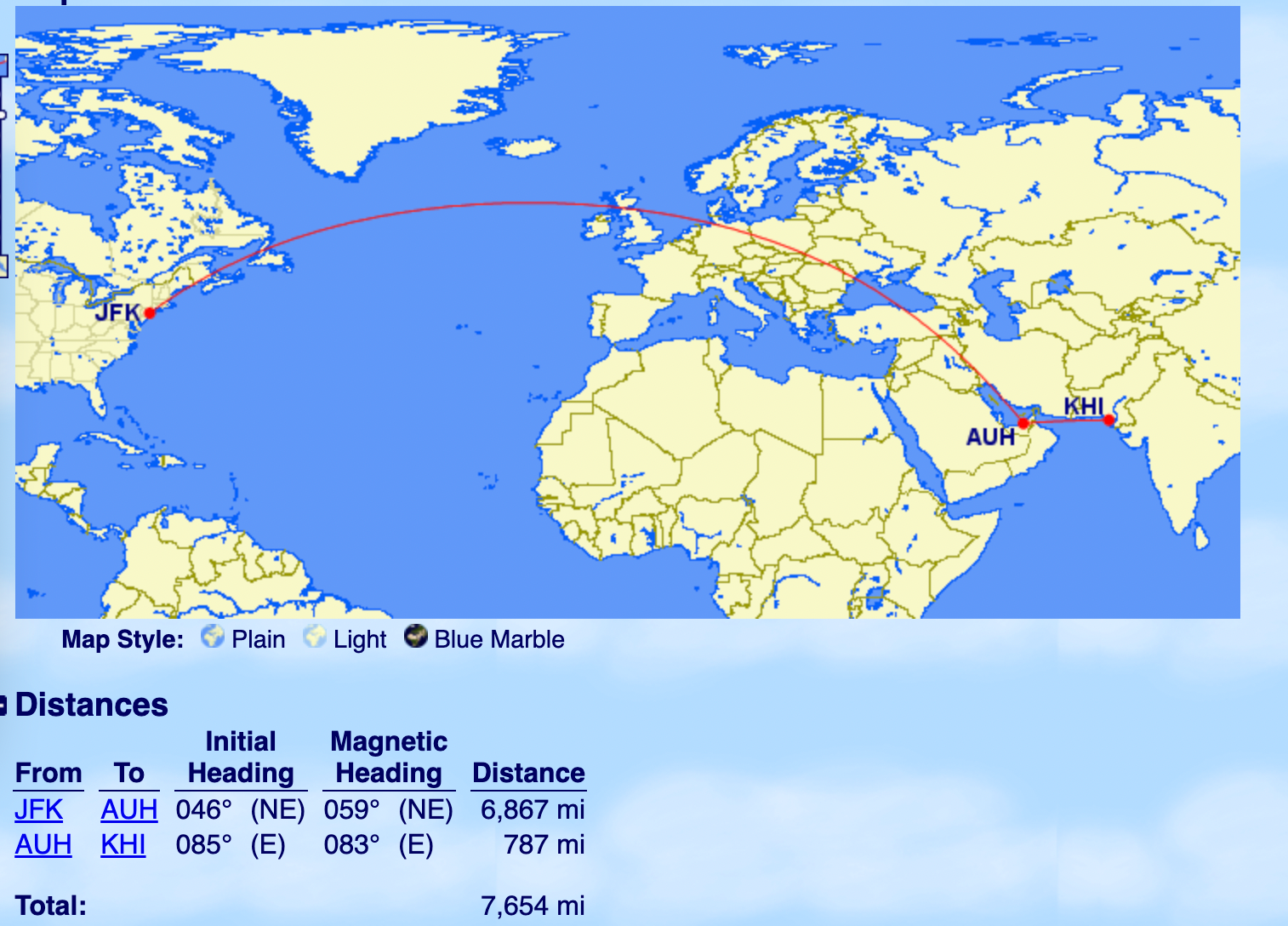 New York to Karachi via Abu Dhabi covers 7,654 miles. Based on the Aeroplan award chart, this costs 95,000 Aeroplan points: 90,000 points for the total distance of the flight plus 5,000 points for the stopover.