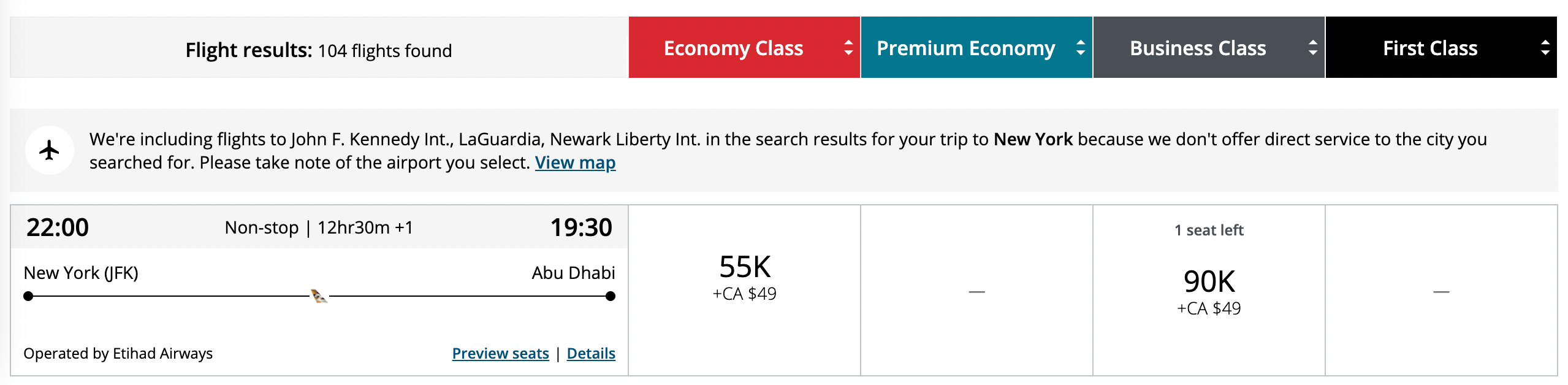 For this example, I first searched the New York-to-Abu Dhabi segment. I used the search filters and narrowed down my search to flights operated by Etihad Airways: