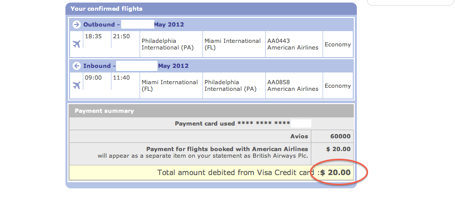 With British Airways' distance-based award chart, PHL to MIA is just 7,500 Avios each way, so 15,000 for each roundtrip ticket, and 60,000 Avios total for our family of four. Had we booked the same flights using American Airlines miles we would have been looking at 25,000 miles per ticket or 100,000 total. Another advantage to booking our AA flights through BA was that we avoided the $75 per ticket penalty AA imposes when you ticket award seats within 21 days of departure, so that saved us another $300. Since BA has improved the visibility of partner flights on their search engine (though not by much!) we quickly and easily booked our awards on britishairways.com for 15,000 Avios and $5 in fees per ticket. Yep - the grand total was 60,000 Avios and $20 for four roundtrip direct flights from our desired departure and arrival cities on our first choice in dates! And of course we put the $20 in fees on our BA Visa card which earns 2.5 Avios for every dollar spent on British Airways purchases, so we were 50 Avios closer to our next trip.