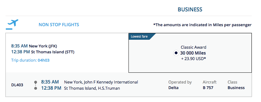 If you're looking for a hop down to the Caribbean and live near either a Delta or United hub, getting to several destinations for 30,000 miles isn't a problem. To fly Delta, transfer your Ultimate Rewards points to Flying Blue and book flights to St. Thomas, St. Martin, Puerto Rico or Bermuda for 30,000 miles one-way.