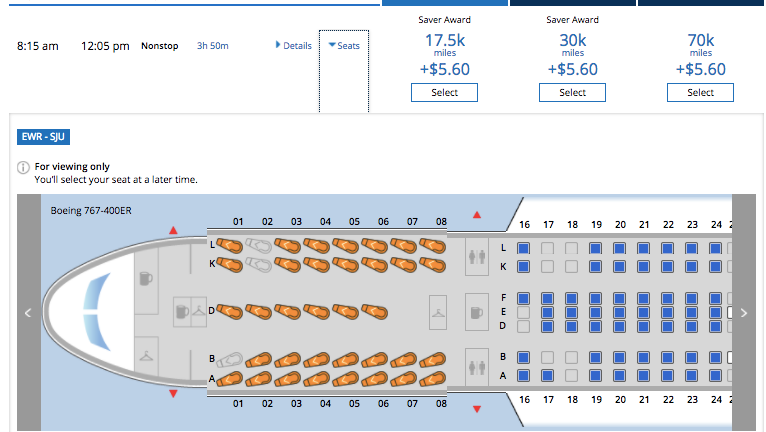 For United, you can fly to any destination in the Caribbean for 30,000 miles one-way. Enjoy lie-flat business seats on this 767-400ER from Newark to San Juan, Puerto Rico: