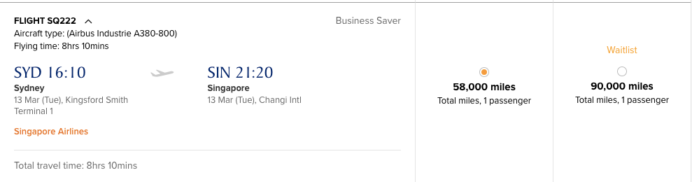 If you're just starting with points and miles and looking for your first business class flight, you probably won't be looking for an all-international route. However, if you're extra motivated and find yourself on another continent looking for your first business-class flight, there are plenty of luxurious rides to be had with your Ultimate Rewards points earned from your Chase Sapphire Preferred. Probably the best right now is the new Singapore A380 from Sydney to Singapore in business class for 58,000 Singapore KrisFlyer miles: