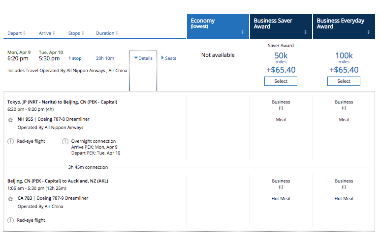 Business class from Japan to New Zealand on two different Dreamliners flown by ANA and the Air China (new 787-9) for 50,000 miles is also a heck of a score: