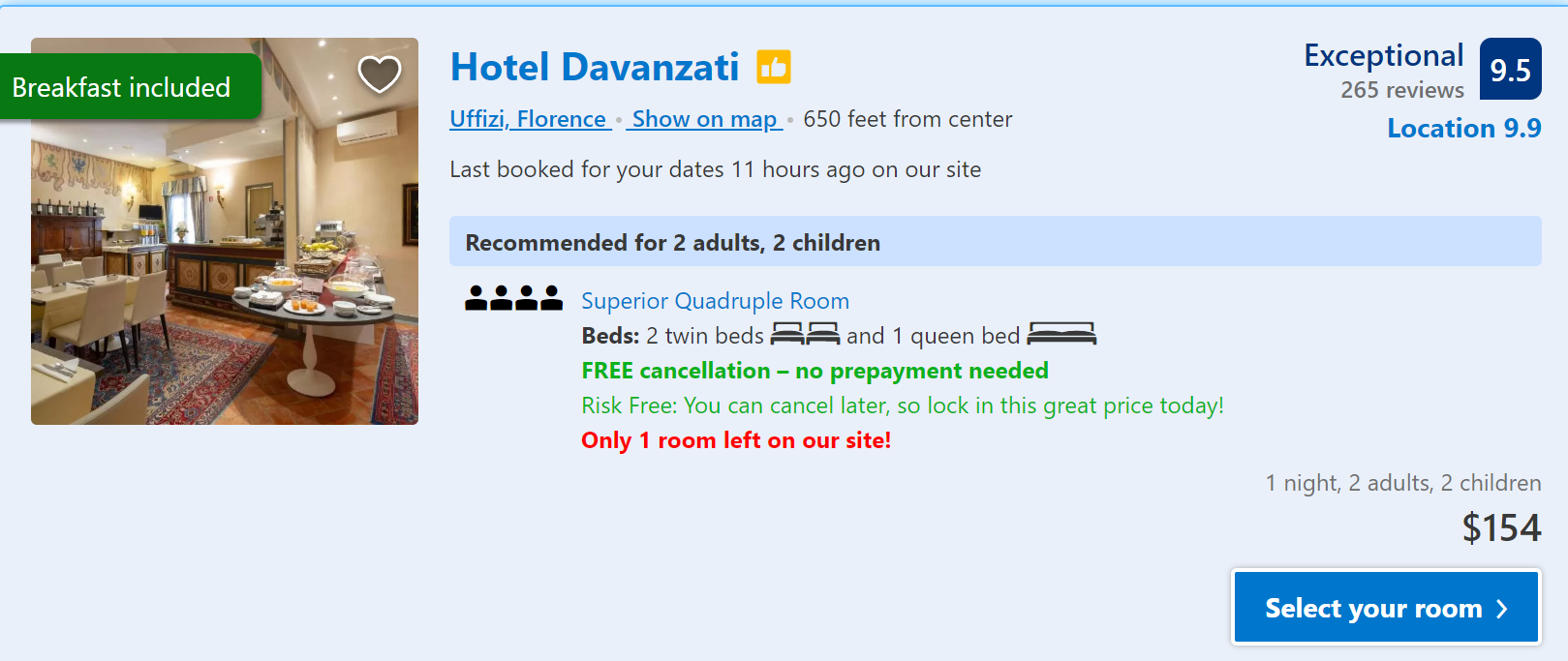 If you've ever tried to book a hotel room for four people in European cities, you've found that not all rooms are cleared for family occupancy. That's certainly the case with some points-friendly hotels. Next in our series on European points hotels that accommodate a family of four (so far we've covered London, Paris, Rome and Portugal) is a center of art and the Renaissance: Florence.