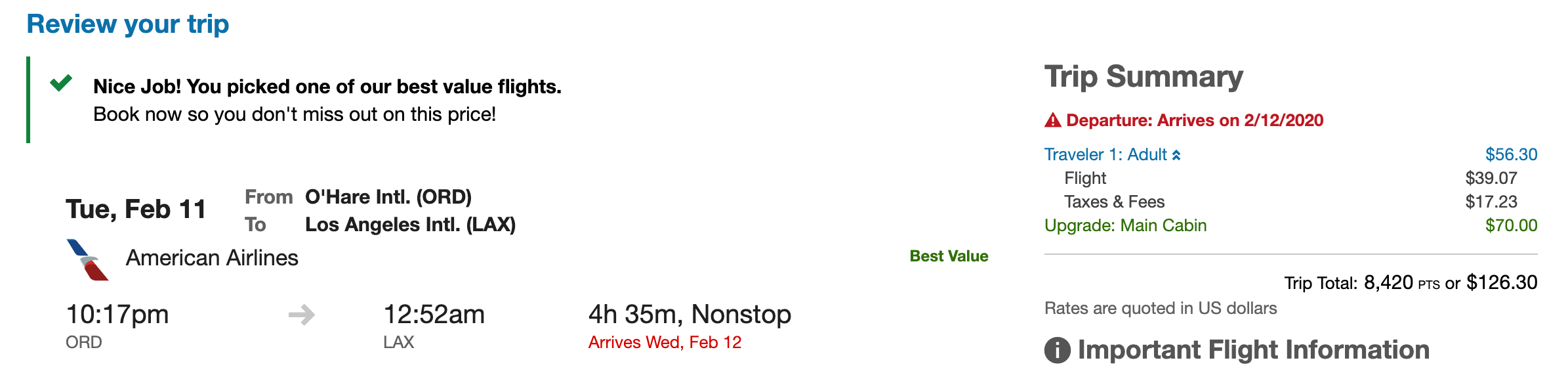 Another option that you should always consider is paying with points, especially if the cost of the cash tickets is low enough. This one-way flight in regular economy (i.e. not basic economy) from Chicago (ORD) to LAX costs $126.30 but as a Chase Sapphire Reserve cardholder, I can redeem my Ultimate Rewards points for it with a 50% bonus. I'll only have to pay 8,420 points, and since this is a cash ticket I'll even earn miles and elite qualifying miles on the flight. Just make sure you don't accidentally book a basic economy ticket.