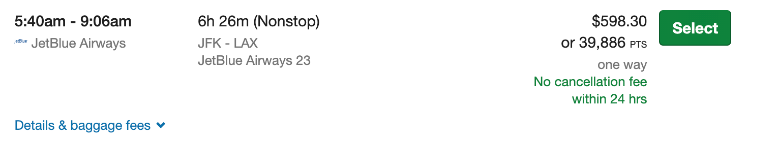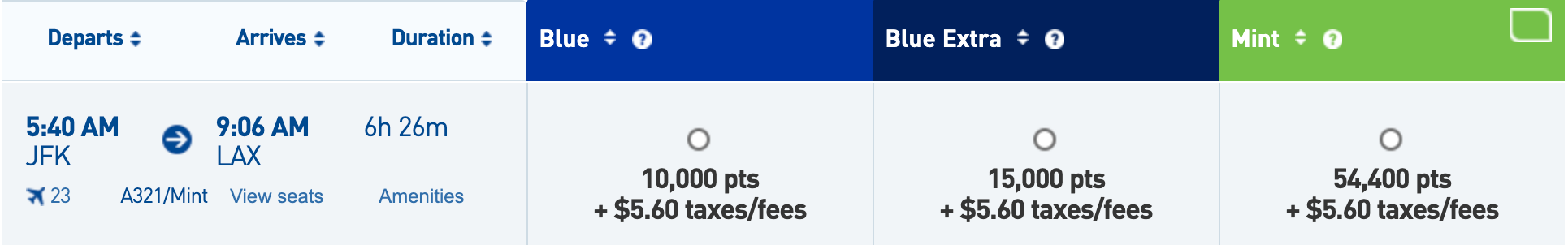 Paying with points is also the best way to experience one of the best premium products flying domestically. Airlines tend to put their best foot forward on the lucrative transcontinental routes between New York and Los Angeles, and by far the best premium class on this route is JetBlue's Mint class. Unfortunately, these flights tend to be pretty expensive when booking through JetBlue. If you opt to pay with points instead, not only will you save over 10,000 points but you'll earn miles on the flight as well.