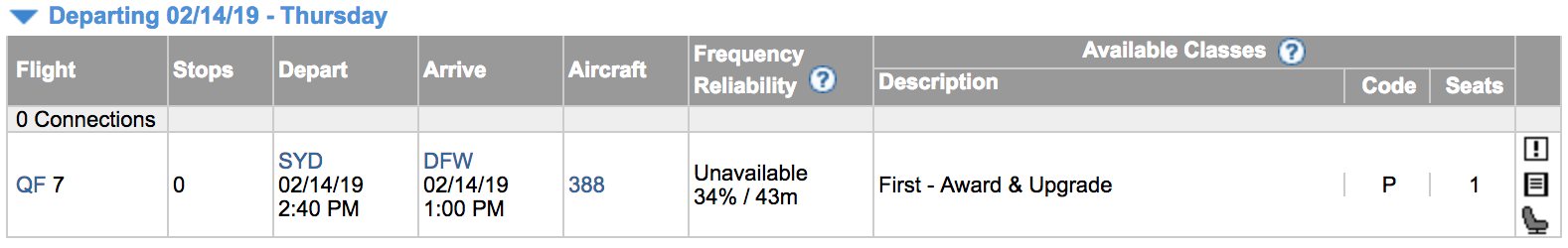 Just how rare is Qantas first class award space? At the time of writing, for the first three months of 2019, there wasn't a single award seat available in either direction between Sydney (SYD) and Los Angeles (LAX). There was a single seat available to Dallas (DFW) on Valentine's Day when I first wrote this article: