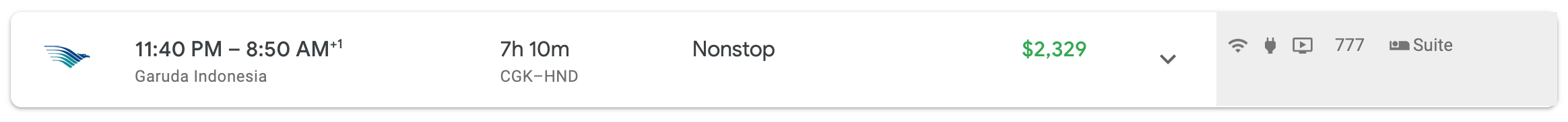 • Jakarta (CGK) to Tokyo-Haneda (HND), though this route is sometimes serviced by a 777-300ER without first class