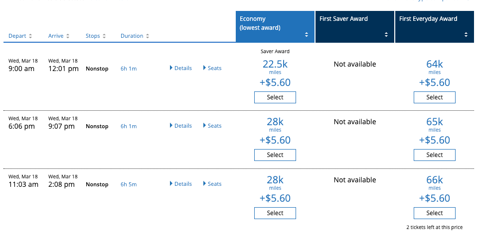 When we take a closer look at booking these flights directly with United, we see (from the right-hand column) that it costs significantly more miles.