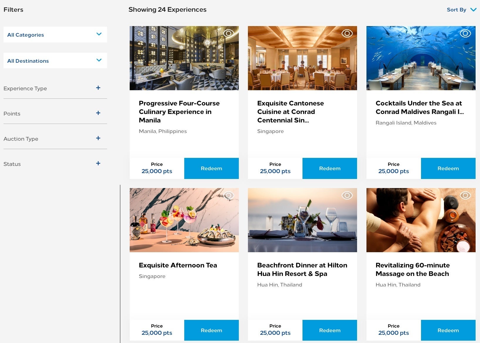 You can sort Experiences by bid count, current bid and time left. You can also filter your search by the number of points required and whether an Experience is an auction or available for immediate redemption. If you're looking exclusively for an on-property Hilton experience, there's a filter for that, too.