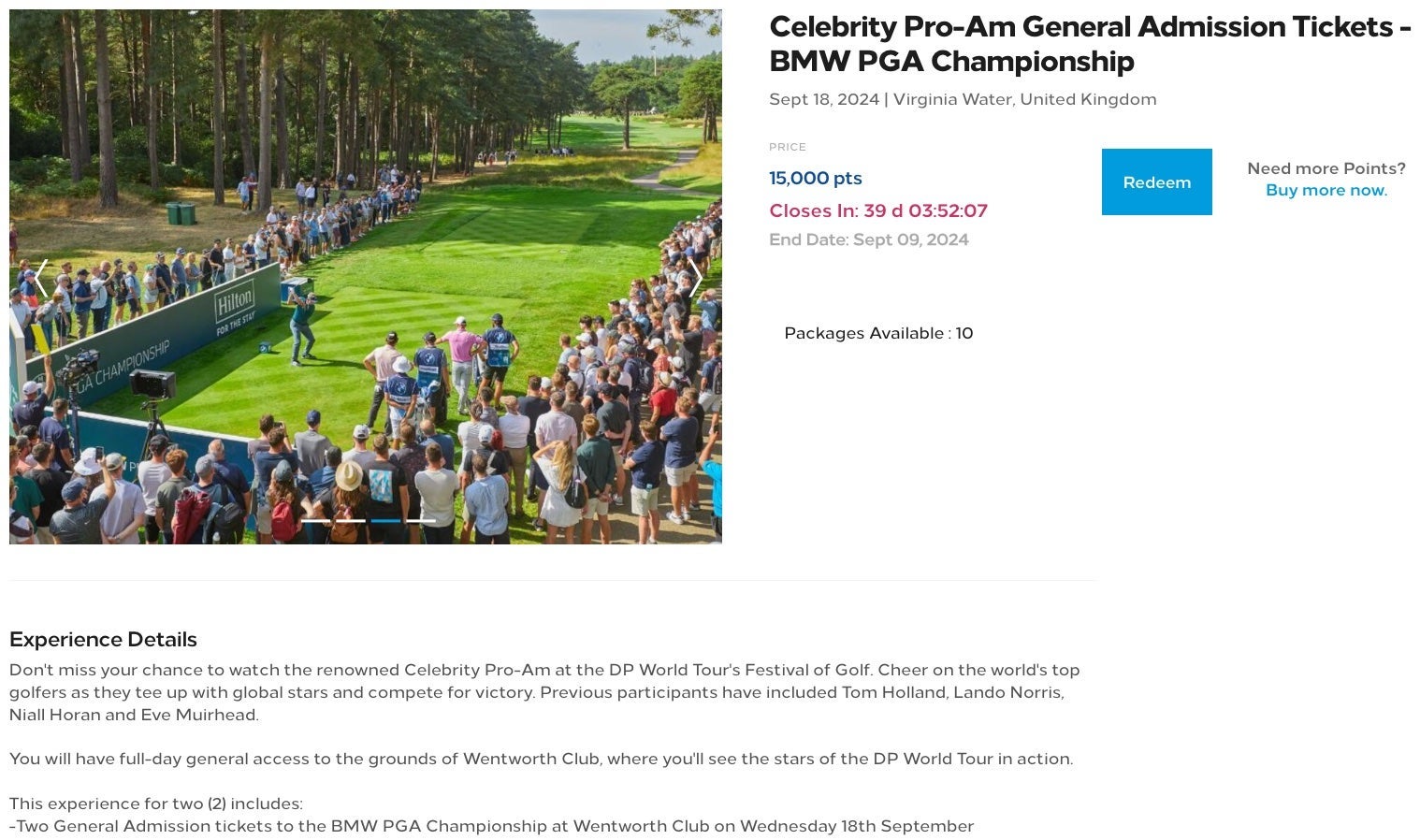 You can book things like PGA Championship tickets (both general admission and VIP), an evening meet-and-greet with various celebrities, Formula One passes and even an activity during your stay at a Hilton property.