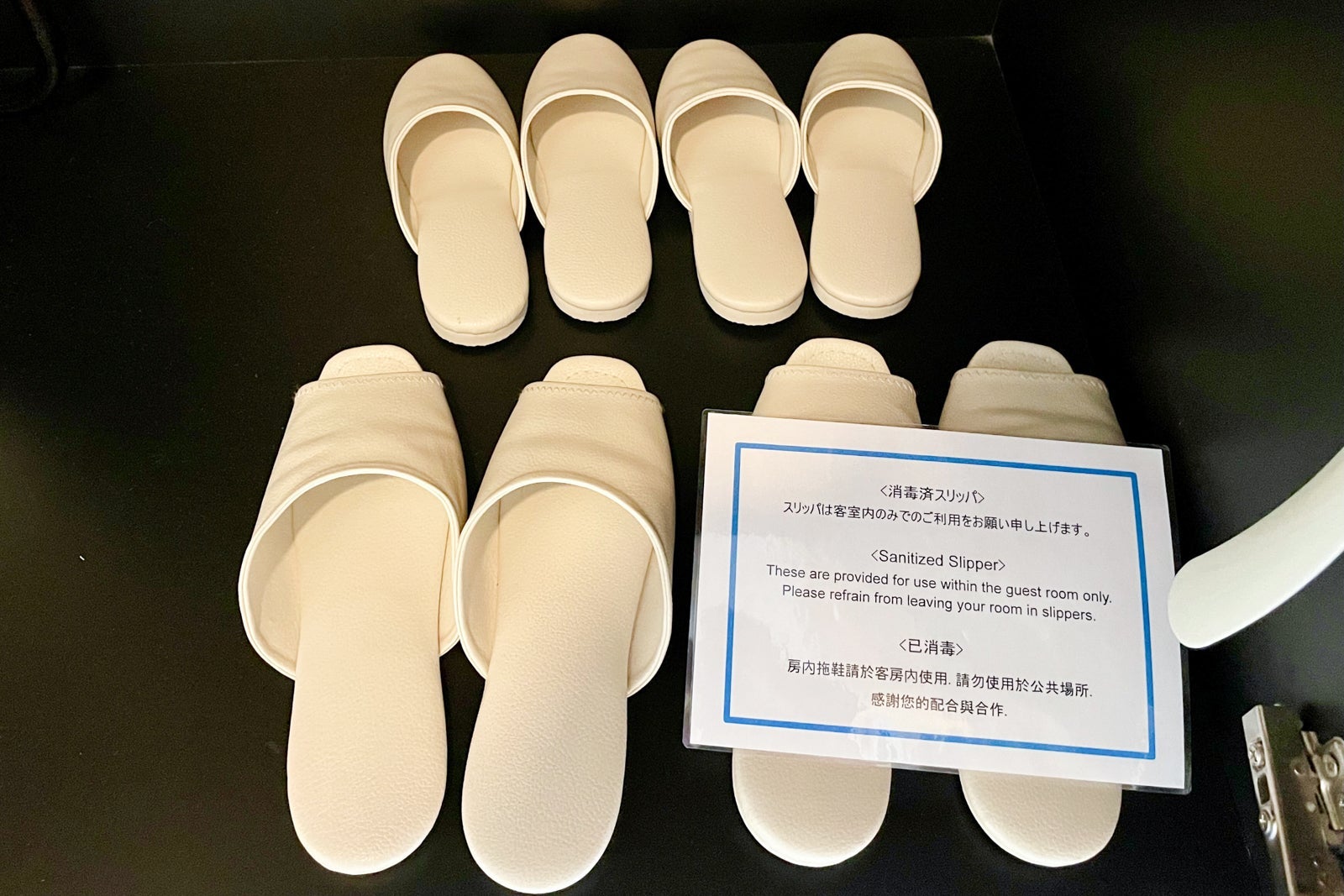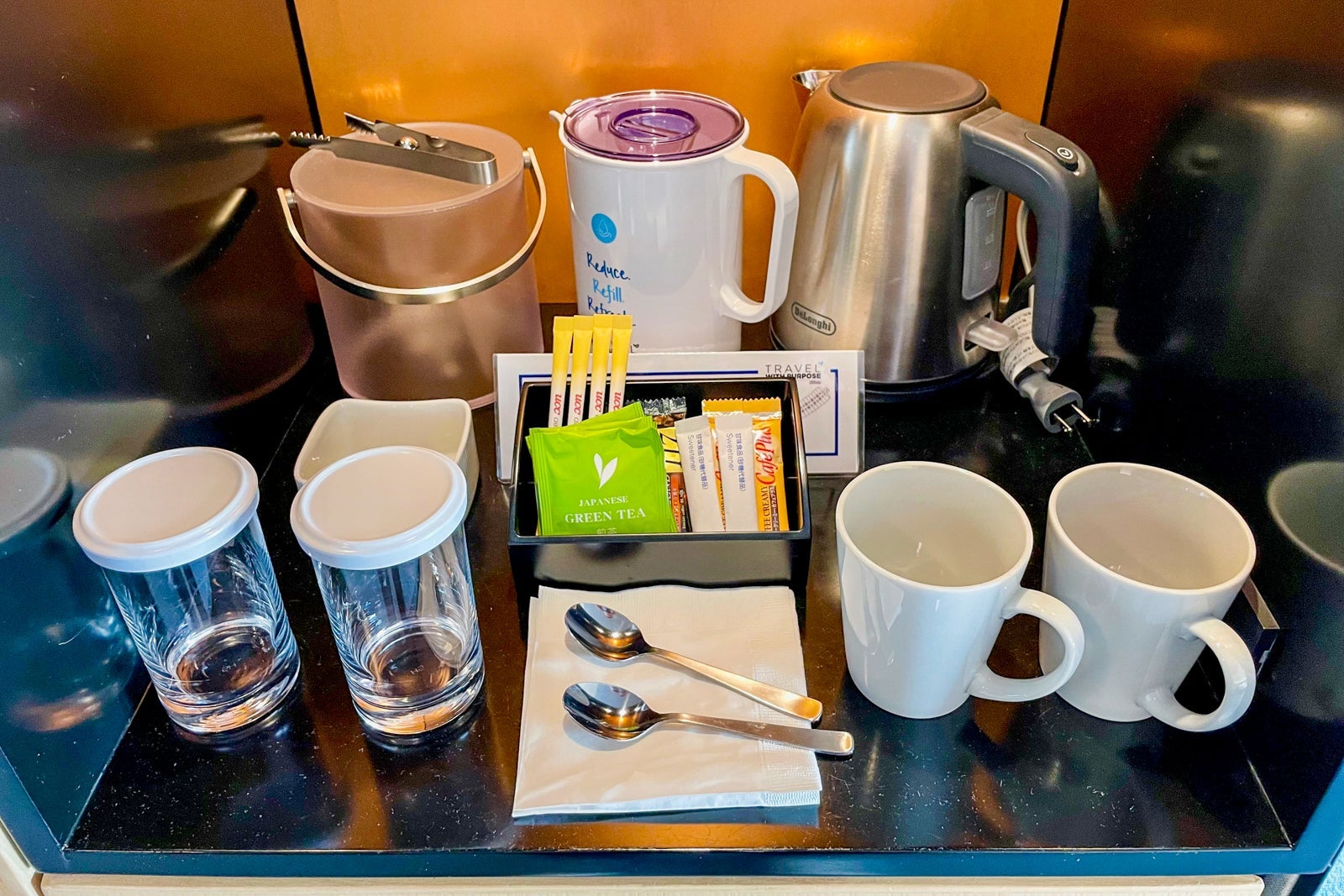 In true Japanese fashion, adult and child slippers are provided in the closet, along with green tea and coffee sachets. To be more environmentally conscious, each room has a reasonably-sized water pitcher that can be filled up at two water and ice stations on each floor.