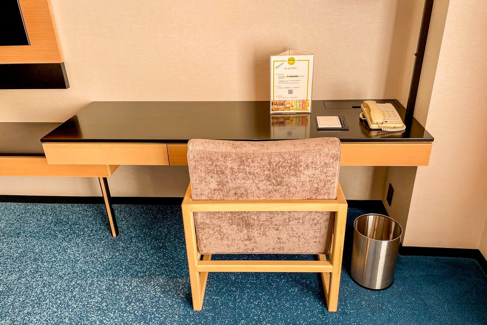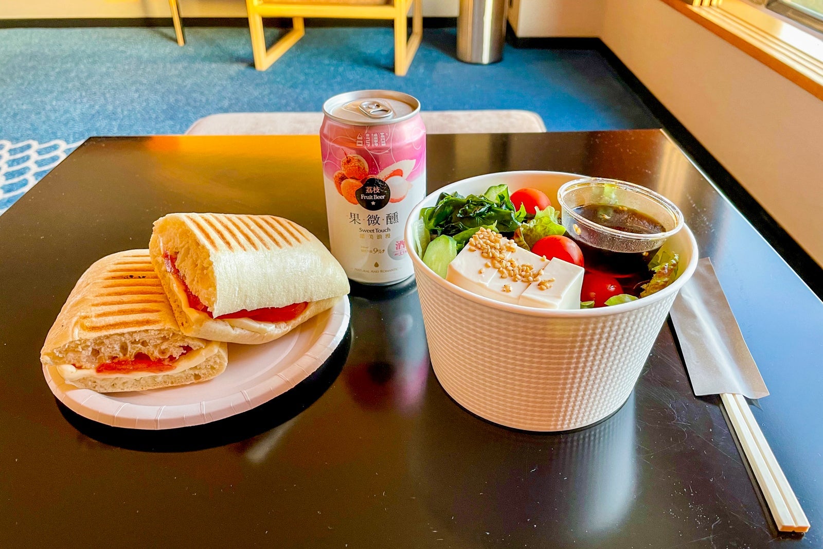 If you're arriving from a long flight in the late afternoon or early evening, you may opt to order a quick dinner through room service. The meal of a mozzarella and cheese panini, Japanese salad with tofu and fruit beer (absolutely not recommended) cost me 2,644 Japanese yen (about $20), including the very reasonable $2.50 delivery fee. It arrived to my room within ten minutes of ordering over the phone.