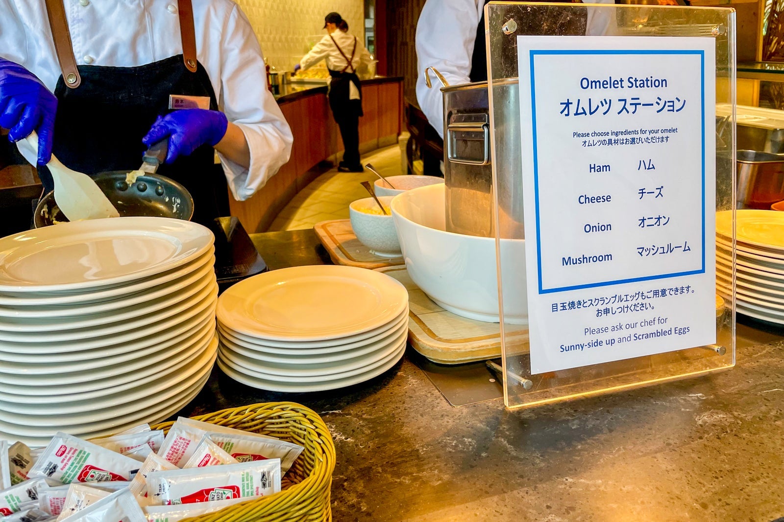 You'll probably want to fuel up with a big breakfast before visiting one of the parks, so the breakfast buffet is a great option for 3,750 yen ($28) for adults and 2,750 yen ($21) for children. There are a ton of Western and Japanese options, with highlights being the made-to-order omelet station and a kids' station. The lowlights included the very sad-looking French toast and the fact that even though this is a large space, it gets very busy with many families with children.