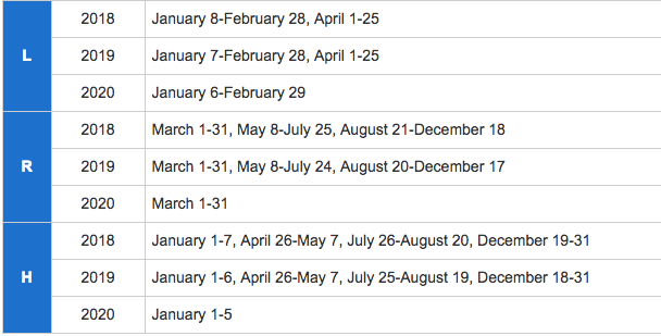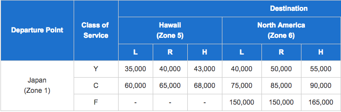 Here are the prices to fly round trip to Japan from the US mainland and Hawaii during each of the three seasons for economy (Y), business (C), and first (F):