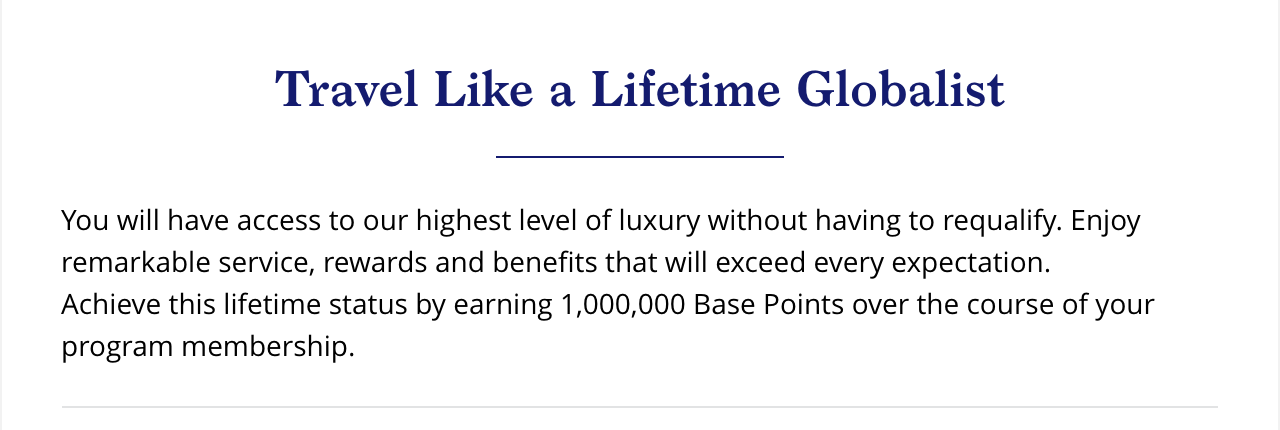 This past March, Hyatt launched its rebranded "World of Hyatt" loyalty program. While the changes make it harder to qualify for top-tier Globalist status on a yearly basis, Hyatt's lifetime status is the simplest and most straightforward of them all. Globalist is the only level you can earn, and there's only one requirement: