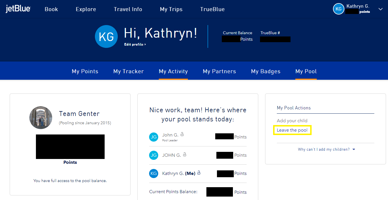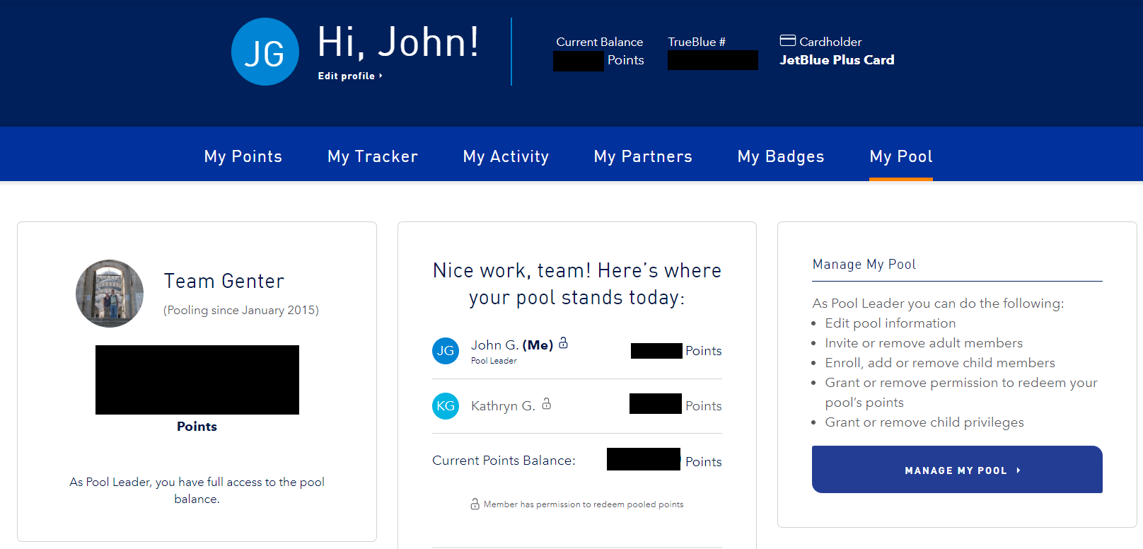 First, if you previously had a JetBlue Family Pool, there's no action needed; all Family Pools have been converted to Points Pools with the same members as before. You can check out your pool's current total and member-by-member balance view under the My Pool tab of the new JetBlue dashboard: