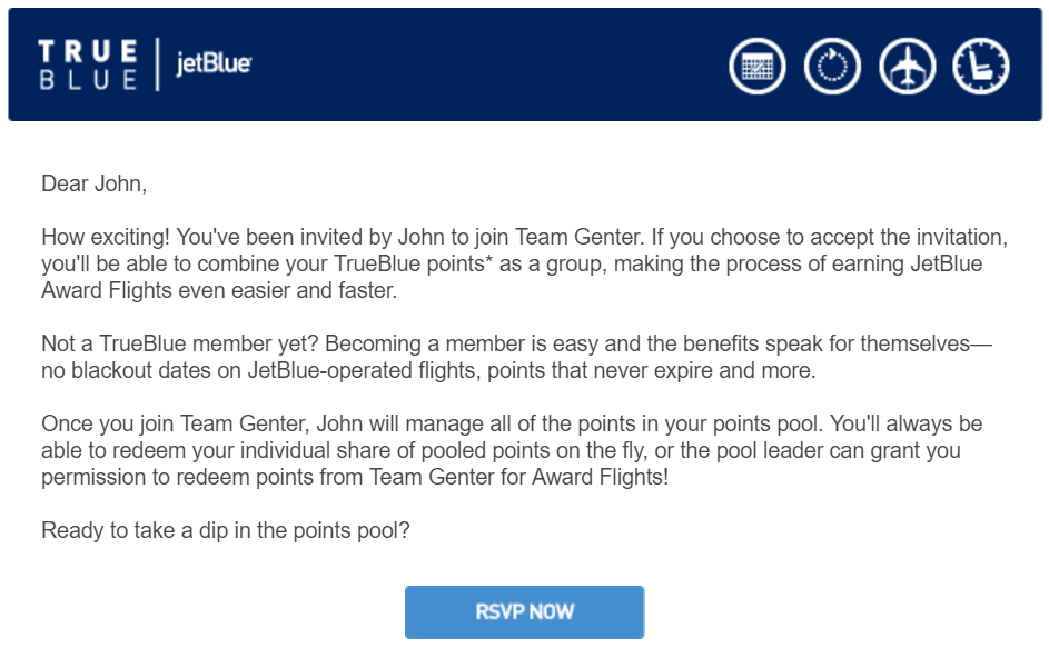 If you've been invited to join a Points Pool, you'll get the "exciting" news via email. Clicking the "RSVP Now" link will let you either log into your account to accept the invitation or create a new TrueBlue account.