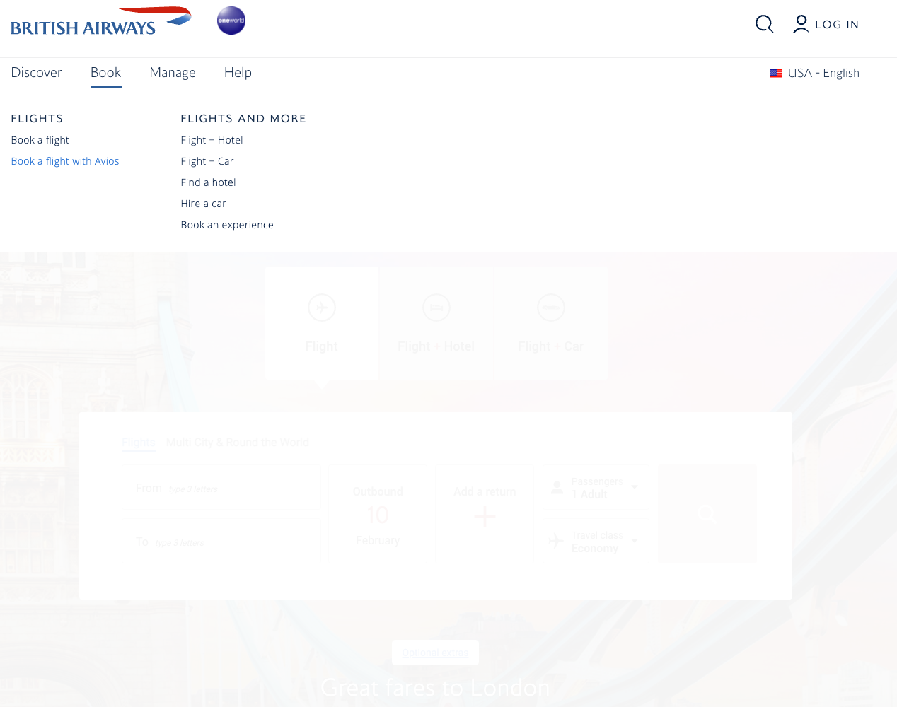 Log into your British Airways account and hover over the "Book" tab at the top of the screen. You'll see "Book a flight with Avios" — click that.