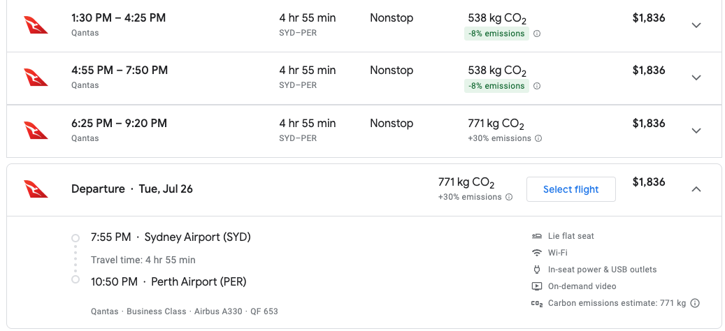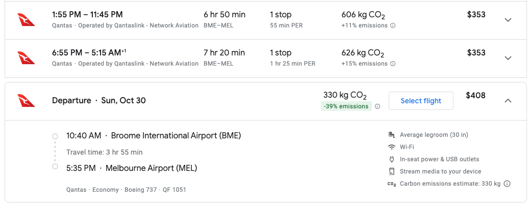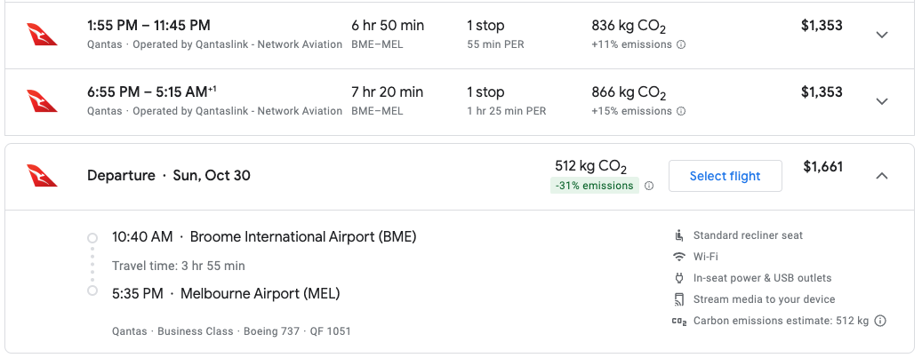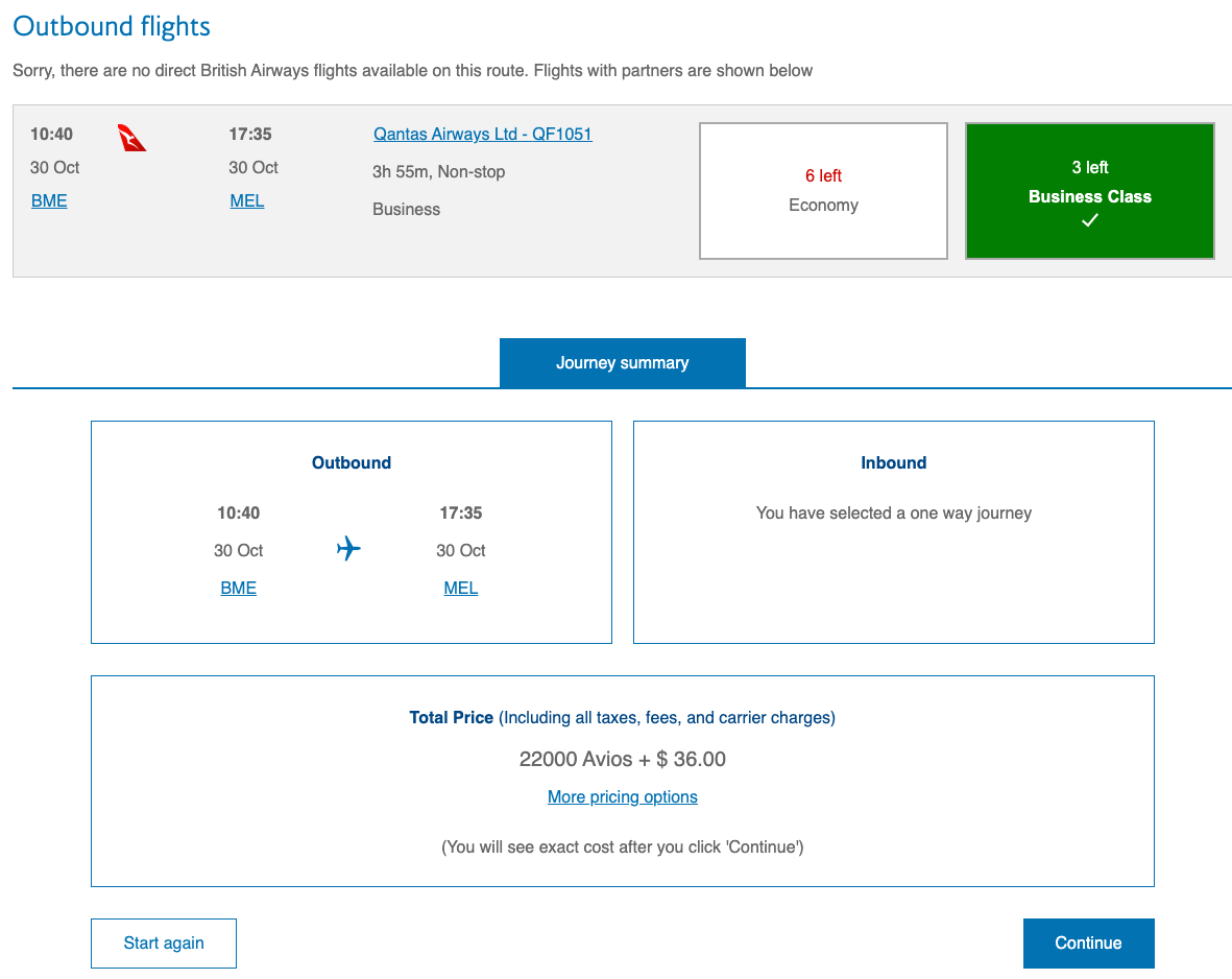 For example, here's a flight from Broome to Melbourne — a 1,900-mile trip — and one of the longest nonstops in all of Australia. You'll pay just 11,000 Avios and $36 for a coach flight.
