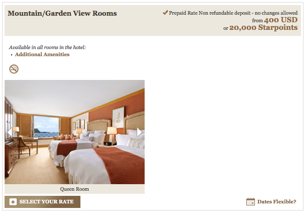 Room upgrades start at 1,000 Starpoints per night and suite upgrades start at 3,000 points depending on hotel category. With both, upgrades can only be requested and confirmed 5 days prior to arrival if space is available, and you must be booked with a flexible rate which include RACK, COR, SET, or BAR rates.