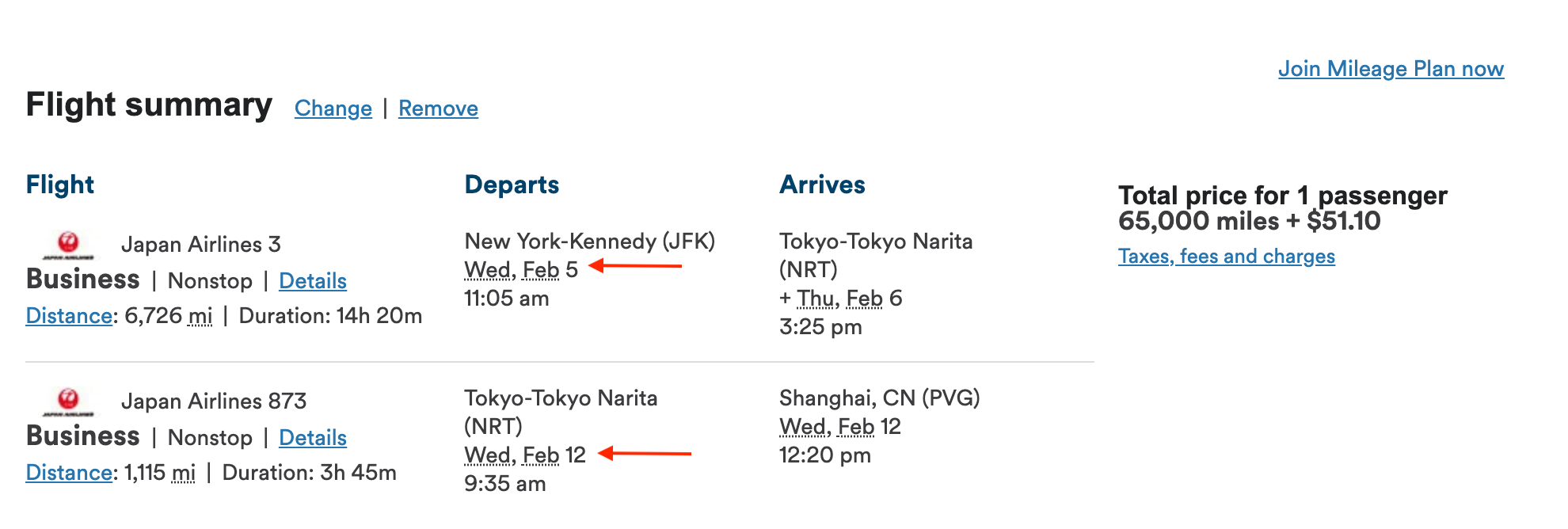 Here's an example of an online search for a flight from New York-JFK to Shanghai (PVG) on Japan Airlines with a six-day stopover in Tokyo.