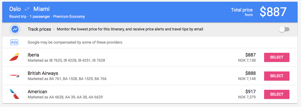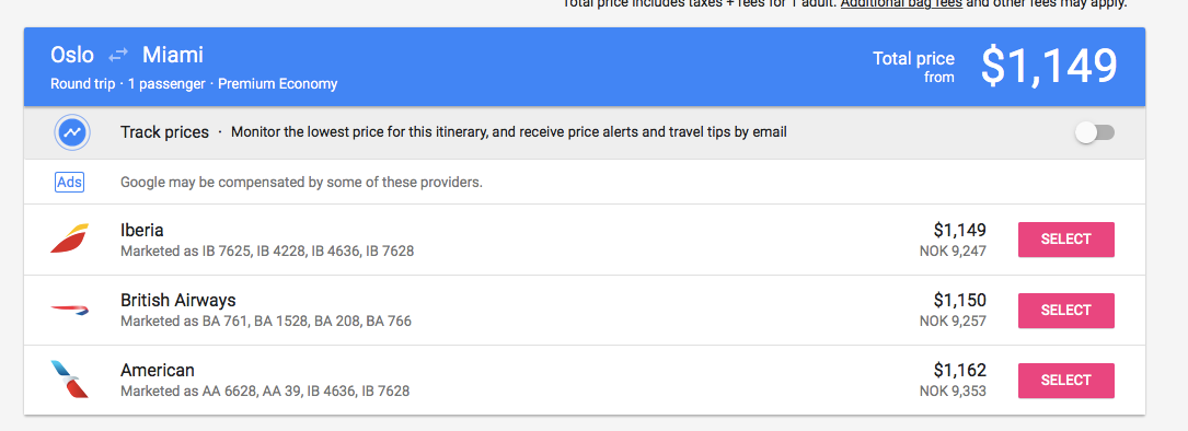 Let's consider this premium economy deal on British Airways from Oslo (OSL) to Miami (MIA):