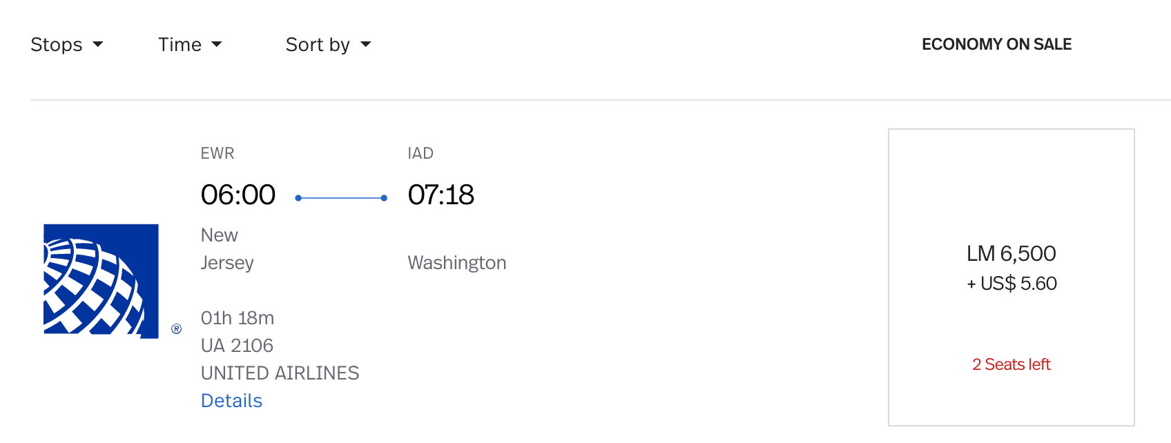 Let's start by looking at flights operated by United Airlines. Avianca LifeMiles will price out some shorter flights, like this Newark (EWR) to Washington DC (IAD) trip, at only 6,500 miles each way in economy.