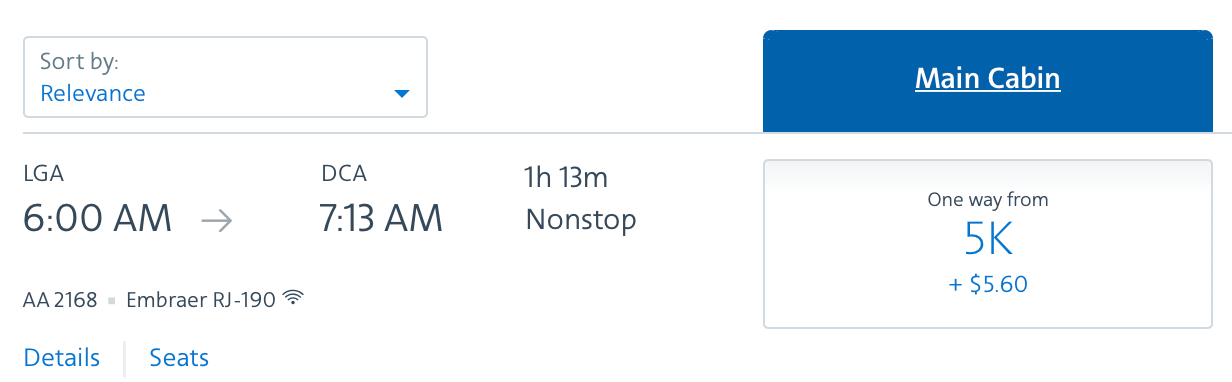 American AAdvantage is still in the process of fully rolling out dynamic award pricing, so to some degree, you can still expect awards to follow a fixed award chart. That means that flights under 500 miles in distance will often cost 7,500 miles each way, and flights over that will often cost 12,500 miles. Still, you might get a nice surprise when you go to book, like this short shuttle flight from LaGuardia to DCA for only 5,000 miles instead of 7,500. Be sure to click on the web specials since some lower cost award options live in that tab.