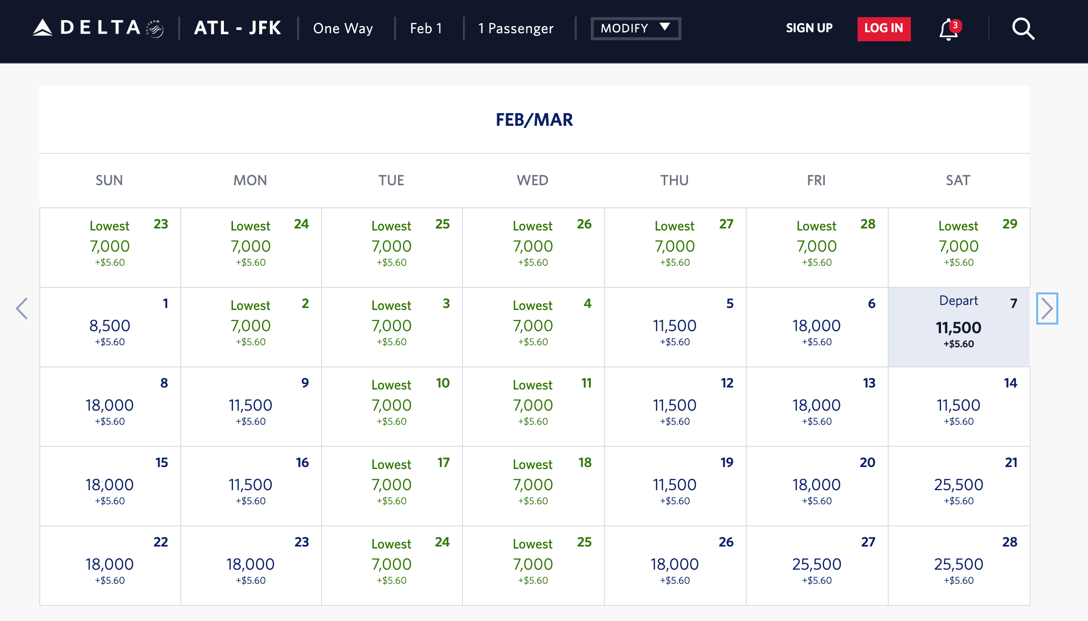 Delta SkyMiles' dynamic award pricing is quite variable, making it really hard to predict what a flight might cost. Here, you can see that flights from Atlanta to JFK vary from 7,000 SkyMiles on the low end to over 3x more on the high end.