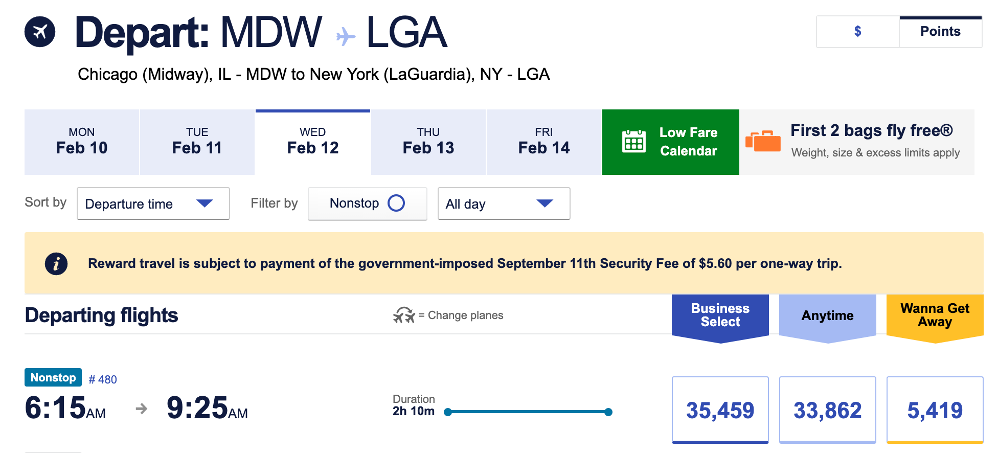 Southwest Rapid Rewards uses a truly revenue-based award pricing system, meaning that your award ticket's cost is directly tied to the cash price of the fare. This means it's impossible to save up for aspirational high-value redemptions, but you can redeem your points as soon as you earn them without any FOMO. Southwest is also known for offering low fares, like this one-way award between Chicago-Midway (MDW) and LaGuardia for only 5,419 points (as opposed to $89 cash). Of course, you can turn that into a twofer if you have the Companion Pass.