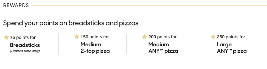 Pizza Hut's Hut Rewards program is the most complicated of the three major chains. It too is revenue-based but has an award chart of different items you can get for free using different numbers of points. You'll earn two points for every dollar spent (including delivery fees but excluding taxes and tips) with no limit to how many points you can earn. Points expire six months after inactivity.